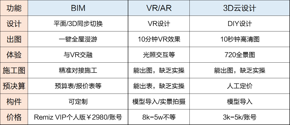 如此之多的创新技术,该选择哪个呢?小编对市面上较火的BIM、VR和3D云设计进行了设计阶段功能及服务对比,如下: